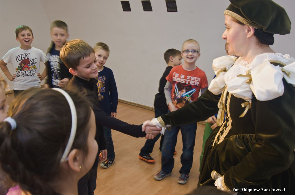 Chwilę później wspólnie z p. Anną Petrus uczestnicy zajęć poznali iście dworskie maniery i królewskie